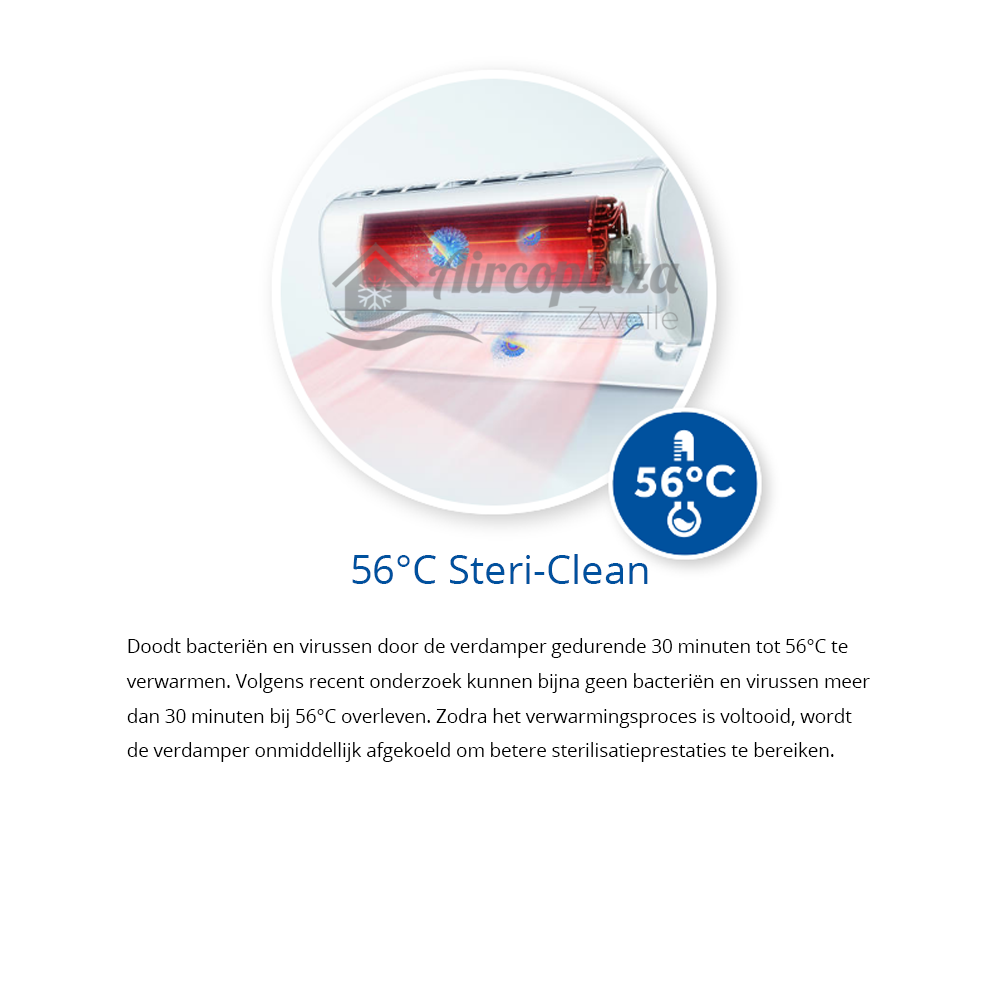De Haier Steri-Clean technologie doodt vrijwel alle bacteriën en virussen in en rond de airconditioner door de verdamper tot 56 C° te verhitten. Zo komt er geen vervuilde lucht uit het toestel. De Steri-Clean technologie is onafhankelijk getest en SGS-gecertificeerd.