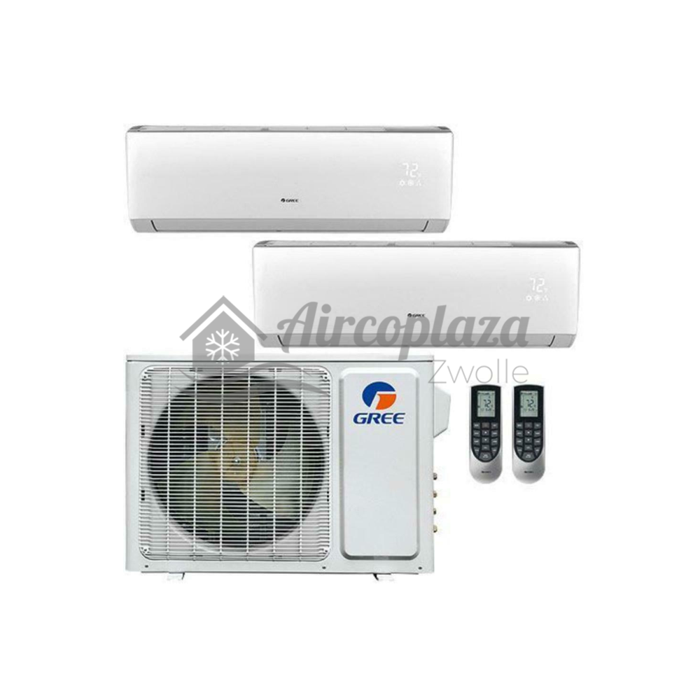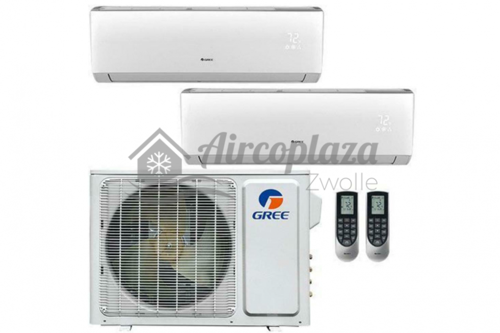 Gree DUO-SPLIT: 1x BUITENUNIT 5.0kW/18000Btu + 2.5kW/9000Btu Binnenunit (90m3 bereik) + 3.5kW/12000Btu binnen unit (12000Btu) (120m3 bereik) Meest milieu vriendelijke koudemiddel R32 - COOL & HEAT + WiFi!