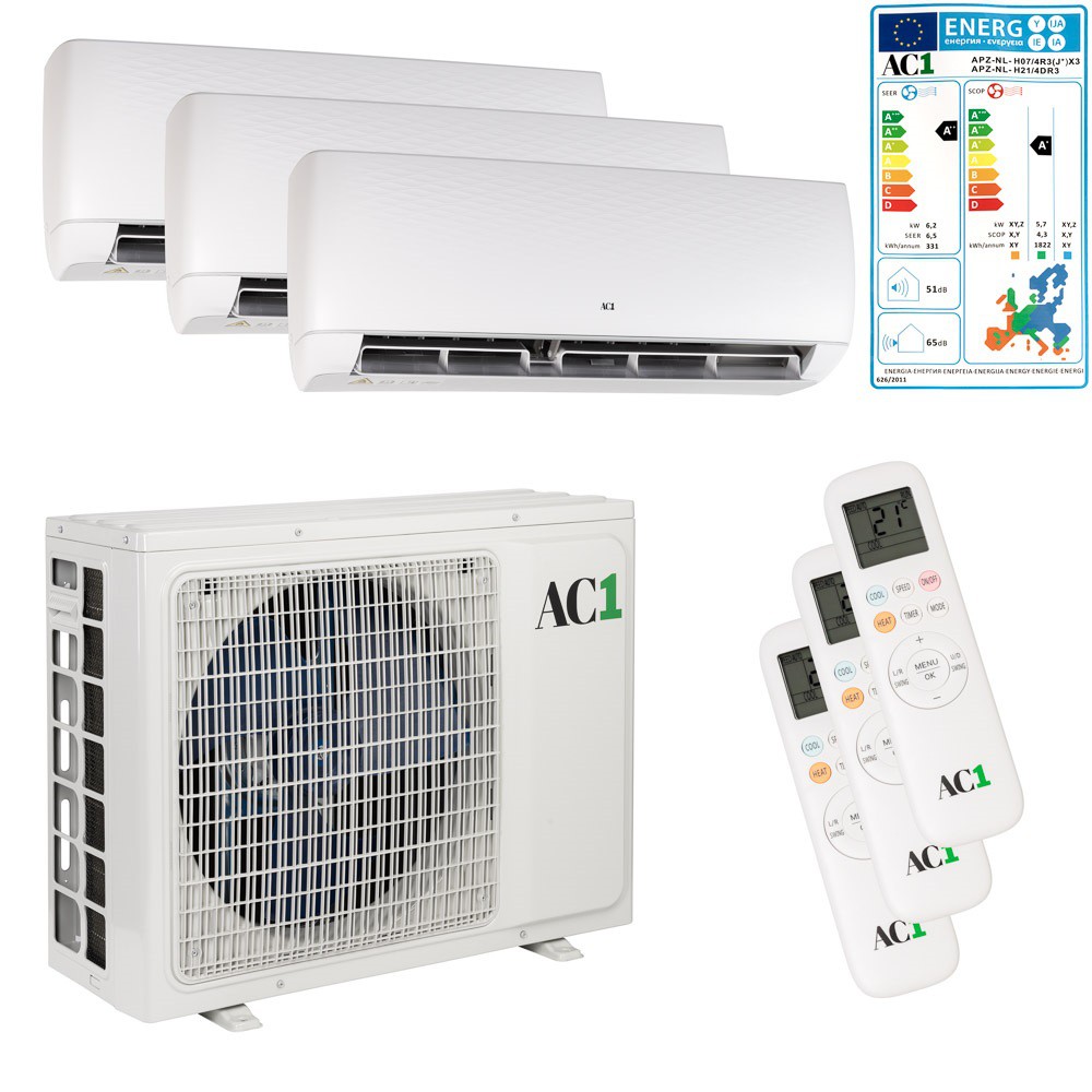 TRIPPLE-SPLIT AC1 8.0kW Buitenunit met 3X 3.5kW/12000Btu Luxe binnenunits Q-Smart ( 3x 120M3 Bereik )